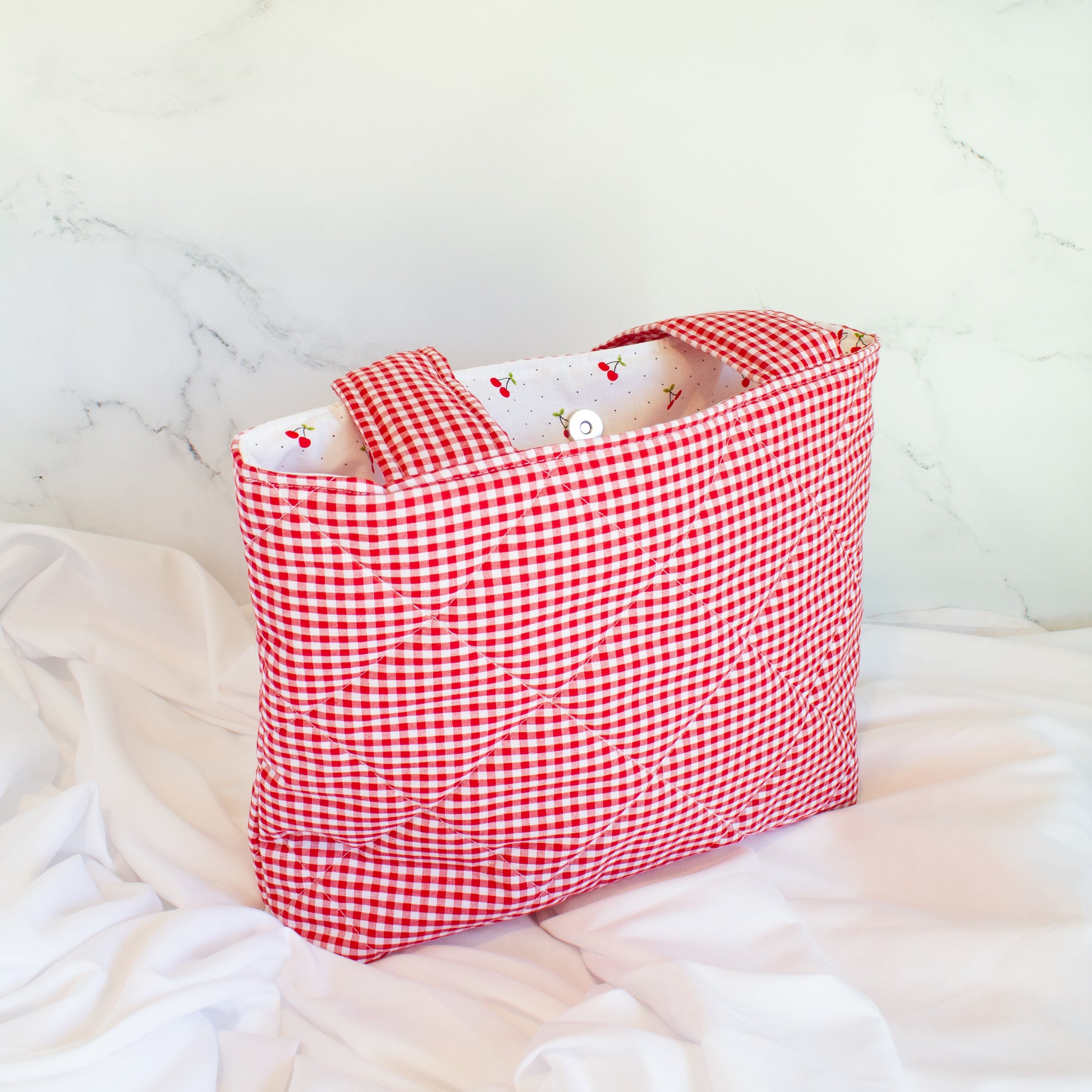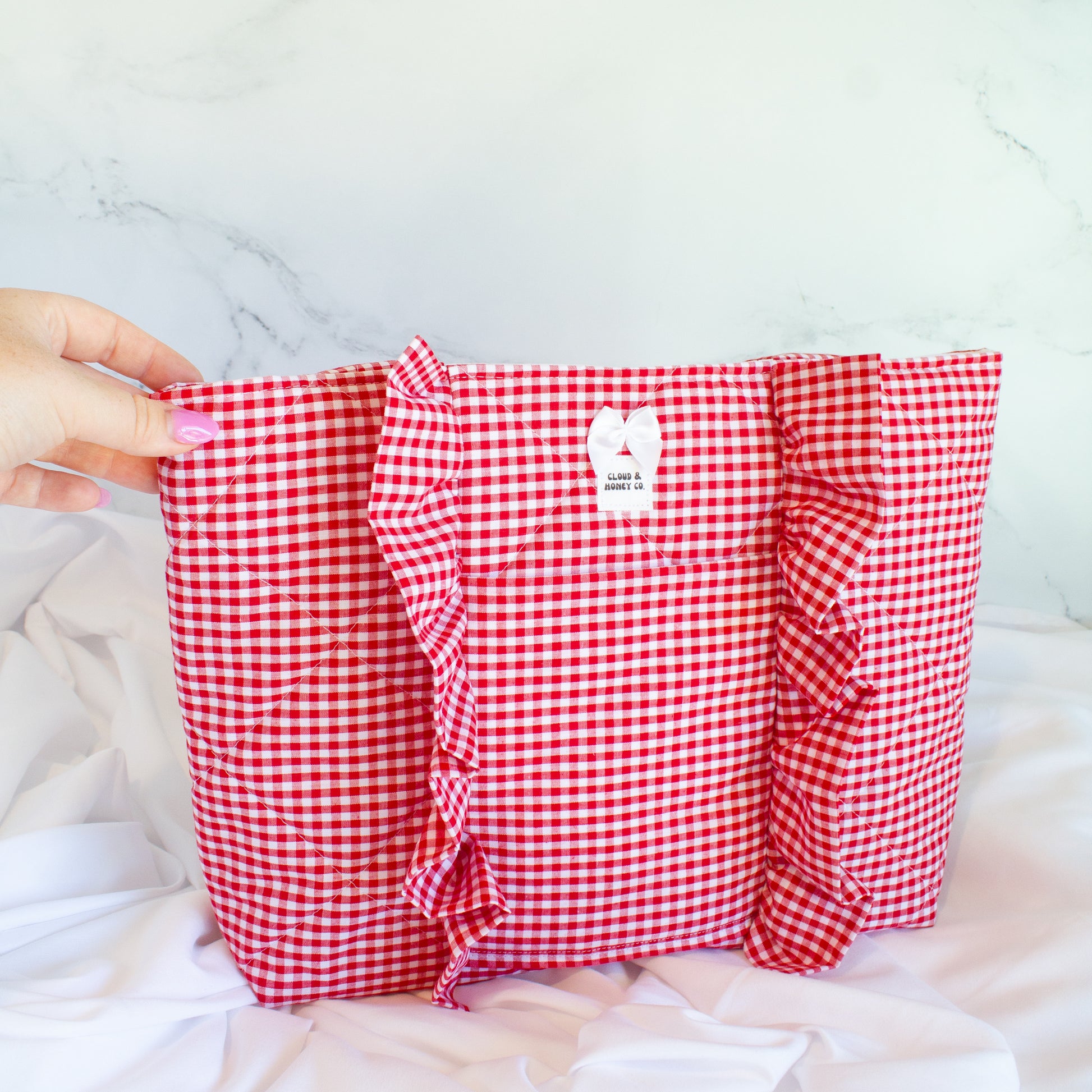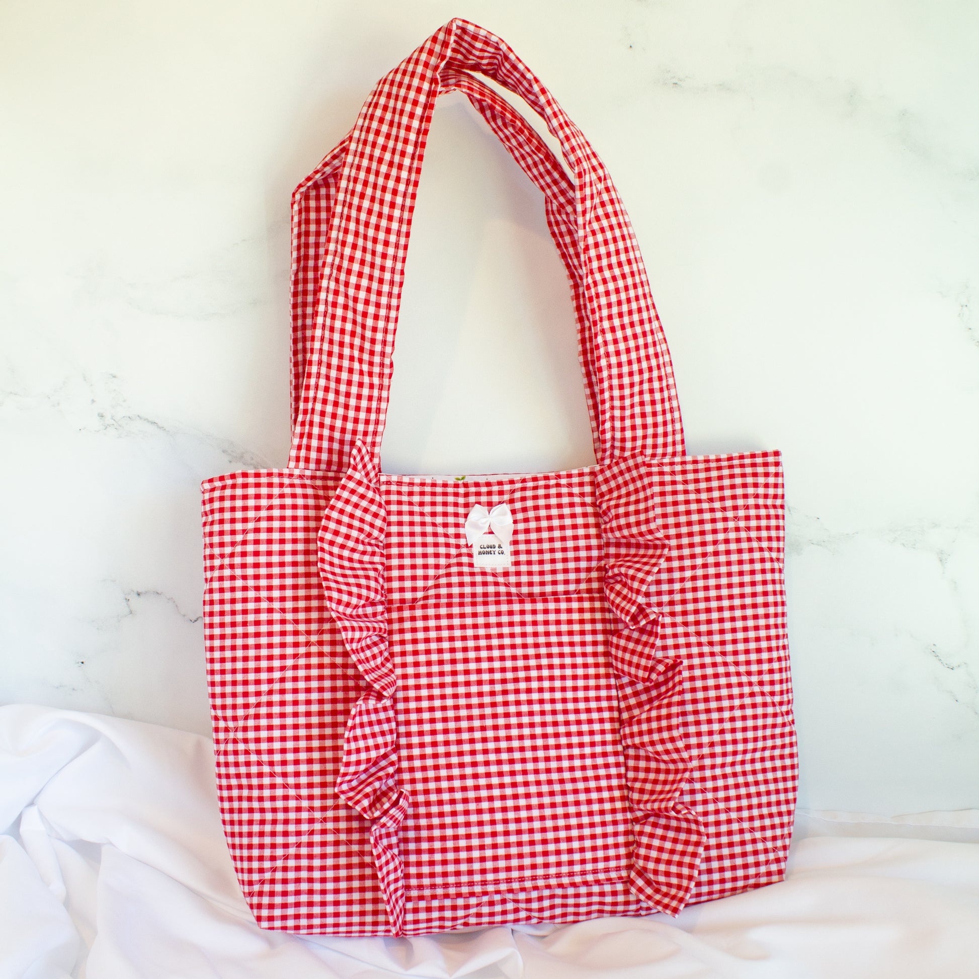 This gorgeous small ruffle tote in red gingham with cherries on the inside is about to become your new daily companion! The adorable vertical ruffles on the front pocket add such a sweet, fun touch to your everyday style π©΅